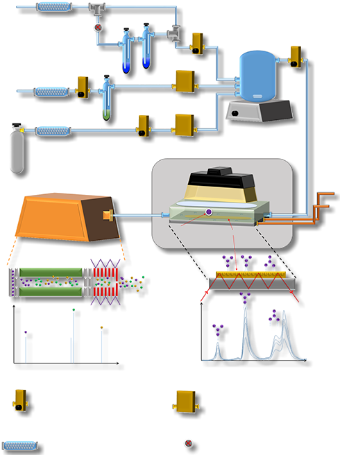 In the flow reactor system, ATR-FTIR spectrophotometry is coupled with atmospheric pressure quadrupole residual gas analyzer (RGA) for multi-analysis of chemical and photochemical reactions on metal oxide particles under simulated environmental conditions (i.e. relative humidity, temperature, solar flux). During the experiment, a thin layer of metal oxide particles deposited on the ATR crystal, placed in the internal compartment of the FTIR spectrometer (Thermo Nicolet is50), is exposed to a steady stream of traces gases. The reactive gases are mixed well prior to introduction to the reaction chamber. Kinetics and speciation of new surface product formation (monodentate, bidentate and bridged) are analyzed by collecting surface IR spectra as a function of time. Primary gases and secondary gas products are quantified using mass spectrometry.