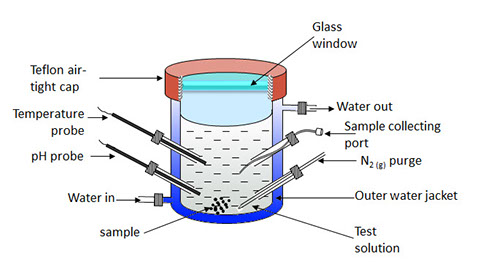 Dissolution measurements are conduced as batch reactor studies in custom-built glass reactors. The glass reaction vessel has a capacity of 100 mL and is stirred using a magnetic stir bar. The vessel has a quartz window with an area of 15 cm2 mounted on top that permitted deoxygenated experiments and is removable to allow for dissolution reactions to proceed under atmospheric conditions. For experiments that requires anaerobic conditions, suspensions are purged with N2 for ∼15 min at flow rate of ~120 mL/min, prior to dissolution. And during the experiment, the head-space of the reaction vessel is purged to maintain positive N2 pressure. The temperature is kept constant, usually at room temperature, through the use of a water jacket integrated to the reaction vessel and monitored throughout the experiment. The pH of the reaction medium is constantly monitored with a glass electrode standardized with pH buffer solutions. Experiments are performed at constant pH and are adjusted with HCl as necessary. Over time, samples are periodically removed from the reactor using a disposable syringe that is connected to 12 cm of Teflon tubing. Aliquots (1 mL) are collected after passing through a 0.2 μm PTFE filter and save for analysis. In photo-induced dissolution experiments, a solar simulator with a 150 W xenon solar simulator (~ 1 sun, Newport) is placed above the quarts glass window.