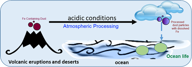 Over the last several decades, it has been recognized that 30% of the world ocean is roughly comprised with high nutrient low chlorophyll regions (HNLC) where the phytoplankton primary productivity is limited by the bio-available iron concentration. It has been suggested that the major source of bio-available iron to surface waters is the deposited Fe-containing mineral dust that has been processed during their atmospheric transportation. Dissolution of iron in mineral aerosol dust can be linked to source material (mineral or anthropogenic), particle size, and mineralogy, and environmental conditions, i.e. pH, temperature and solar flux. The few earlier work on this subject has limited to model systems with only single component Fe-containing mineral (e.g. Fe2O3, FeOOH) that provide detail reaction mechanisms, yet does not add the complexity to the reaction medium to understand the synergistic effects from other metal ions and metal oxides in the mineral dust. In our research, we use proxies such as ilmenite (FeTiO3), that has enough complexity to mimic the mineral dust and yet simple enough to know the details of the reaction pathways. Here, we combine dissolution measurements from batch reactor studies with spectroscopy (ATR-FTIR, UV-Vis, DLS, XRD) and microscopy (TEM, SEM and SEM-EDS) to gain molecular level insights of these hidden surface phenomena.
