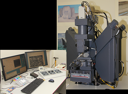 Electron Microprobe for imaging larger partciles. The Cameca SX-100 microprobe at NMT is equipped with 3 wavelength dispersive (WD) spectrometers, plus secondary electron and high-speed backscattered electron detectors. The WDS spectrometers can be used to conduct quantitative analyses on individually selected points, traverses, and point grids.